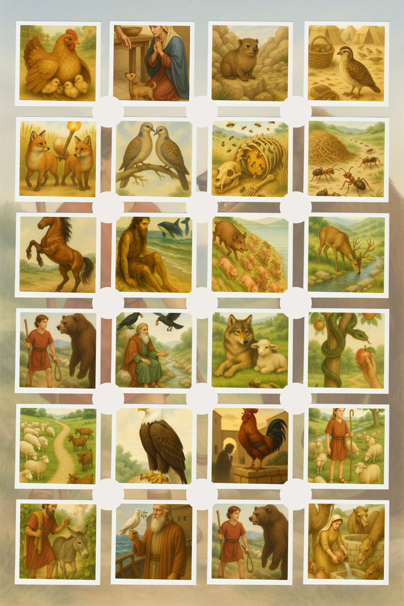 25 verschillende afbeeldingen van dieren uit de Bijbel. Deze afbeeldingen zijn afgedrukt op A4-formaat, ze zijn afgewerkt met een glanzende laag.