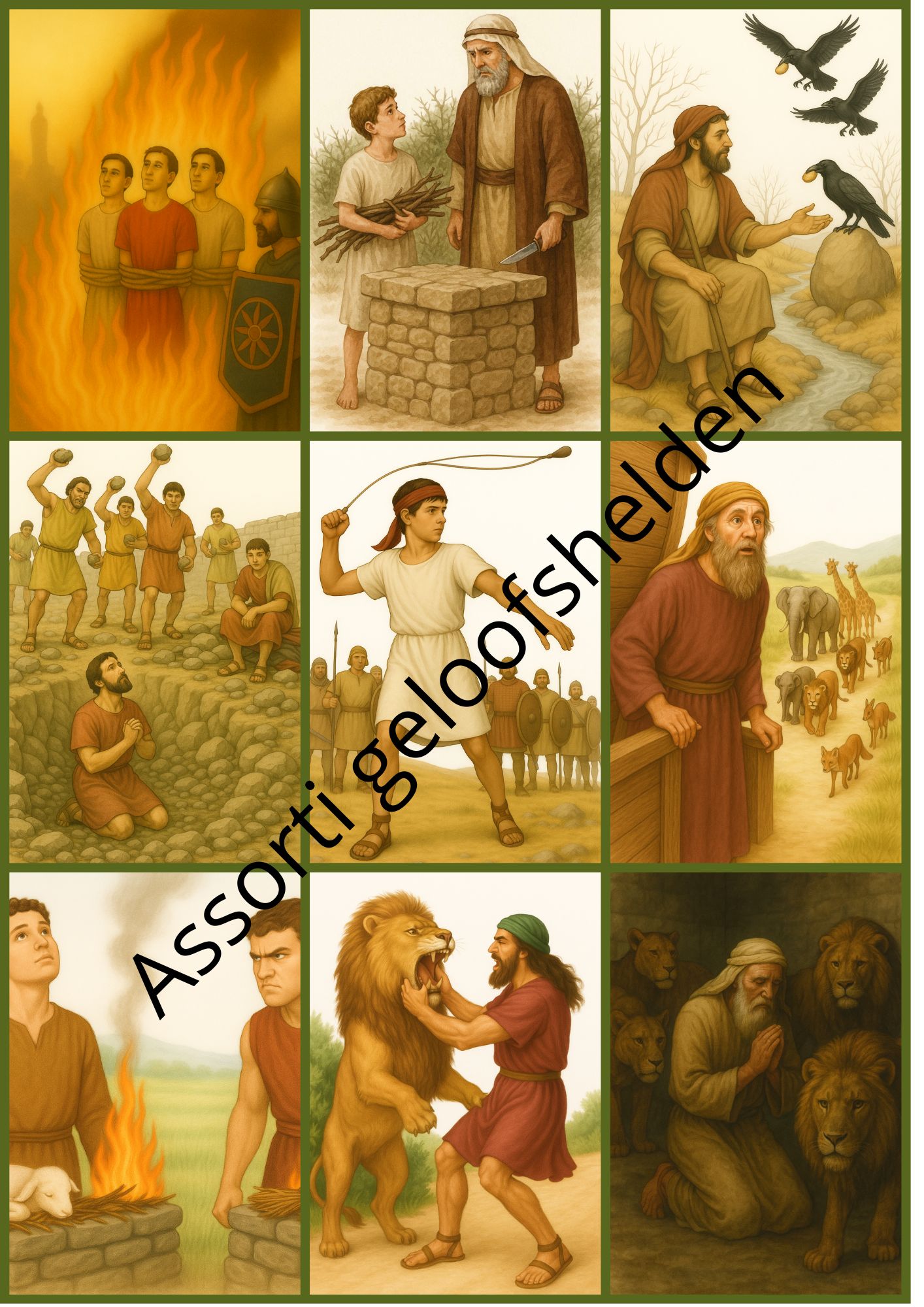 8 verschillende platen uit de categorie ‘‘Geloofshelden’. Deze zijn op stevig A4-formaat afgedrukt.