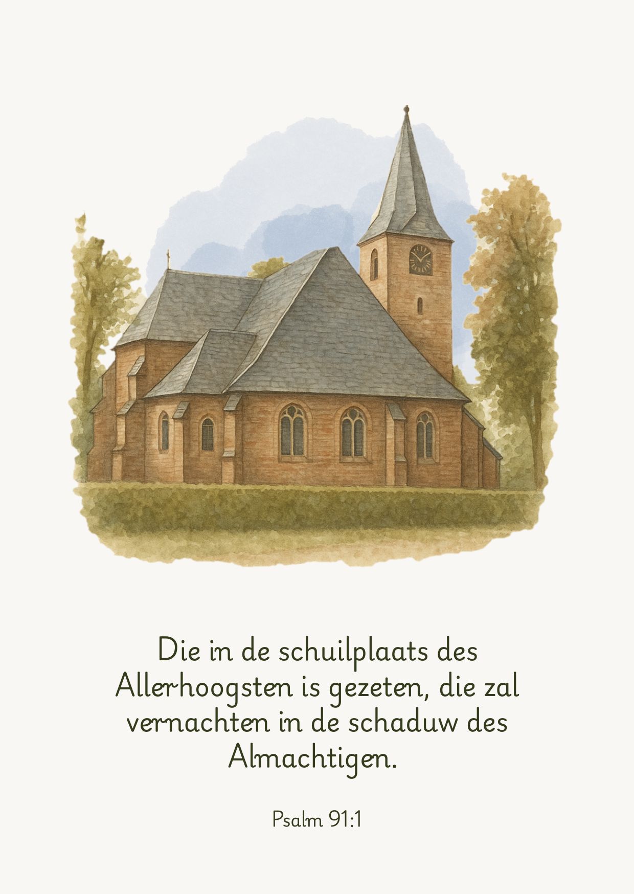 Dubbele ansichtkaart met envelop. Op de voorkant de hervormde kerk van Oene met daaronder een tekst uit psalm 91.
