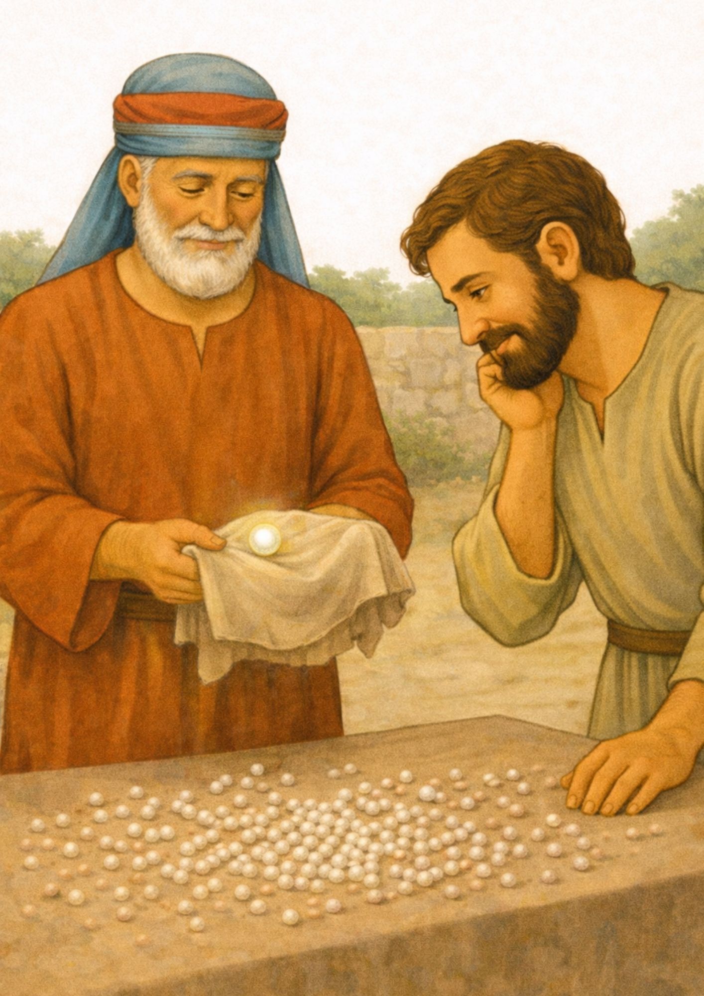 Een plaat op stevig papier A4-formaat van de gelijkenis van de parel van grote waarde. Op de achterkant van de afbeelding is weinig tekst opgenomen, zodat deze ruimschoots te vullen is naar eigen inzicht.