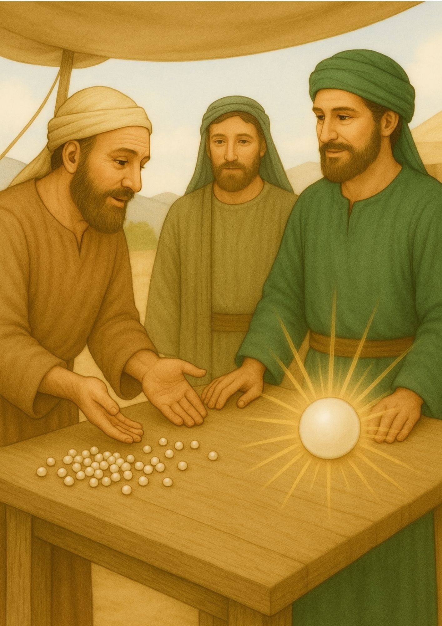 Bijbelse plaat ‘De parel van grote waarde’. Op de voorkant geen tekst. Op de achterkant weinig tekst, zodat deze naar eigen inzicht op te vullen is.