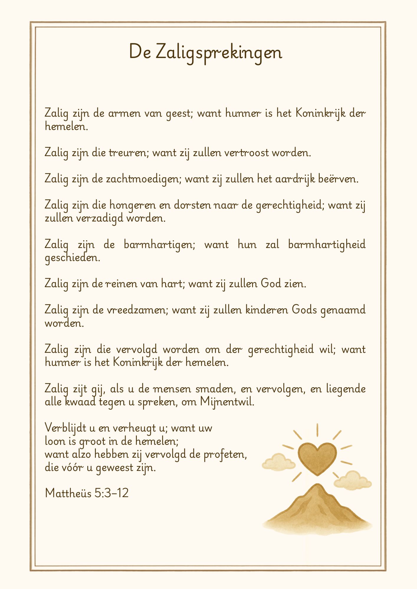 Een plaat op A4-formaat met daarop ‘De Zaligsprekingen of Bergrede’ afgedrukt.
