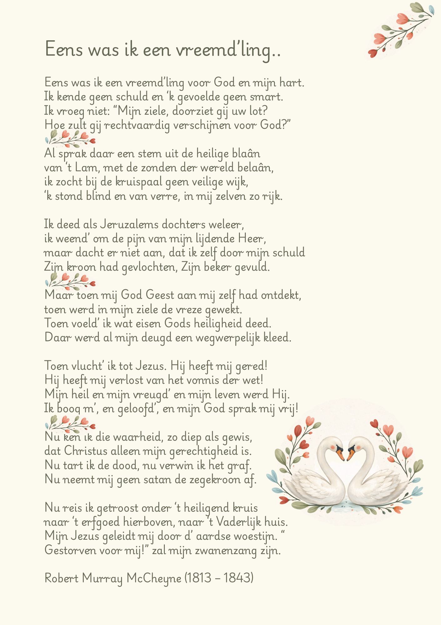 Het bekende gedicht van Robert McCheyne. Eens was ik een vreemd’ling. Afgedrukt op A5-formaat.