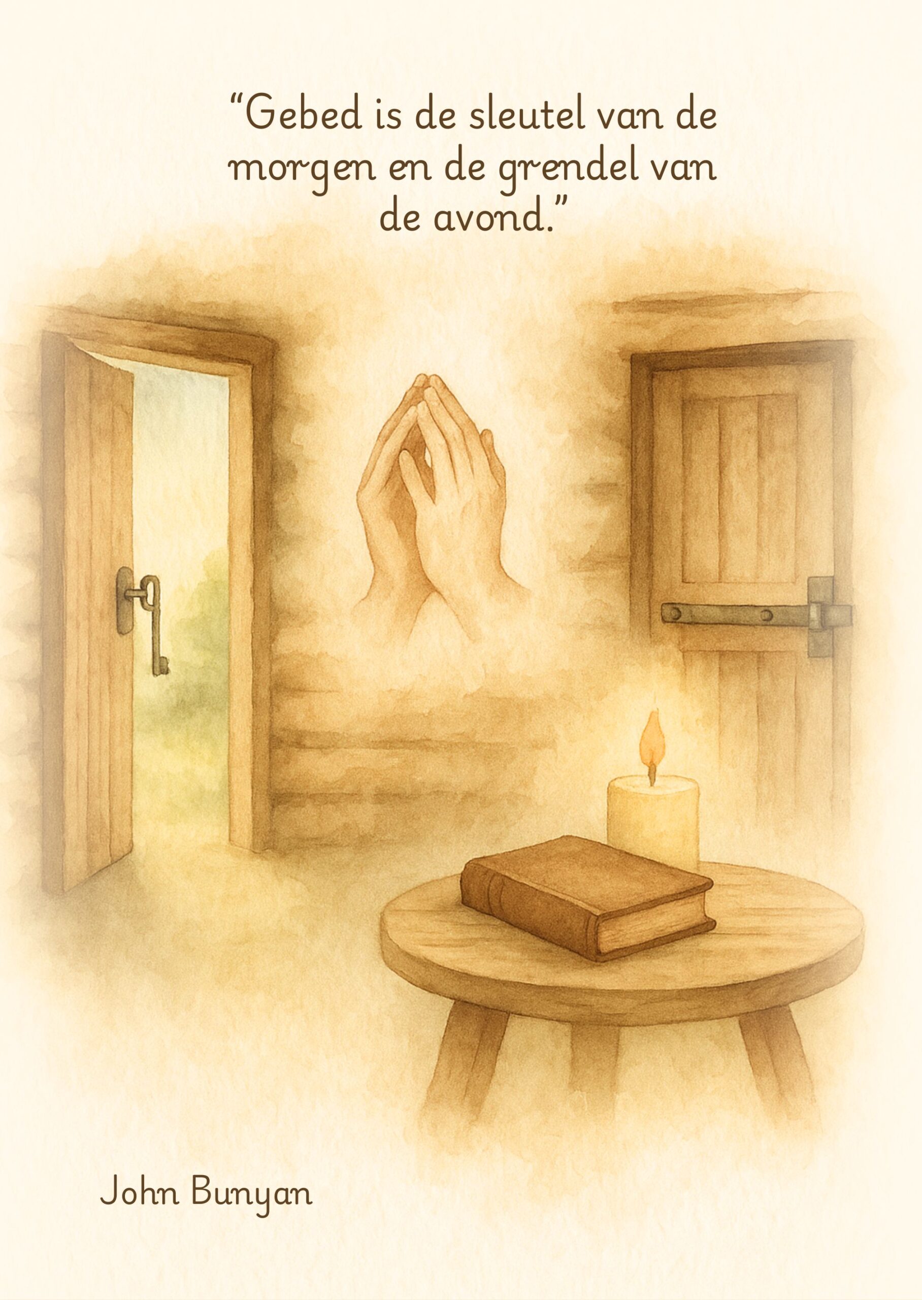 Dubbele ansichtkaart met envelop met het citaat: ‘Gebed is de sleutel van de morgen en de grendel van de avond’.