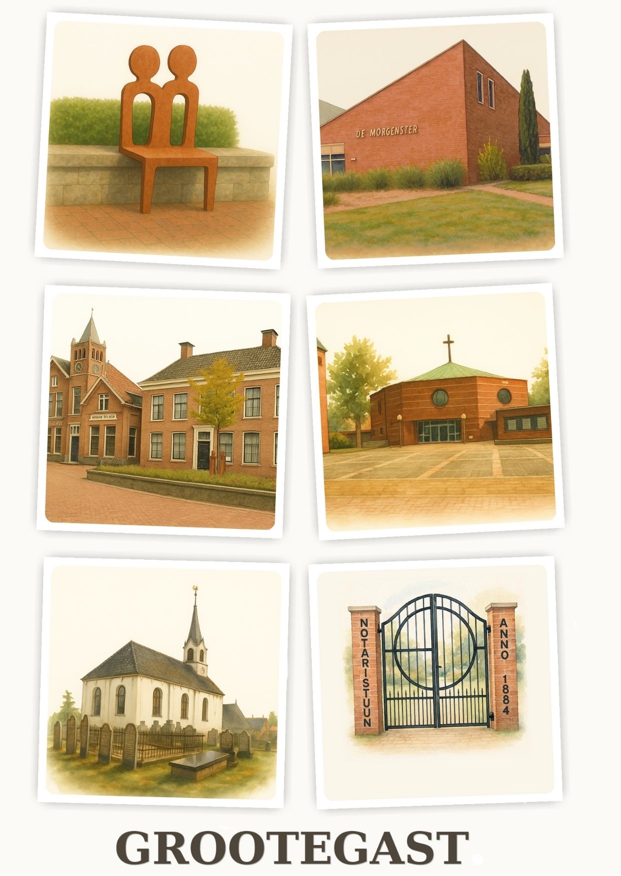 Dubbele ansichtkaart met envelop. Op de voorkant verschillende afbeeldingen uit Grootegast