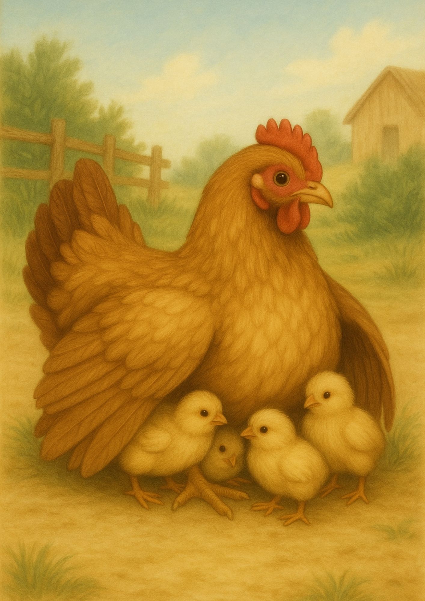 Een afbeelding van een hen met haar kuikens. Het een afbeelding op A4-formaat, afgedrukt op stevig papier met een glanzende laag.