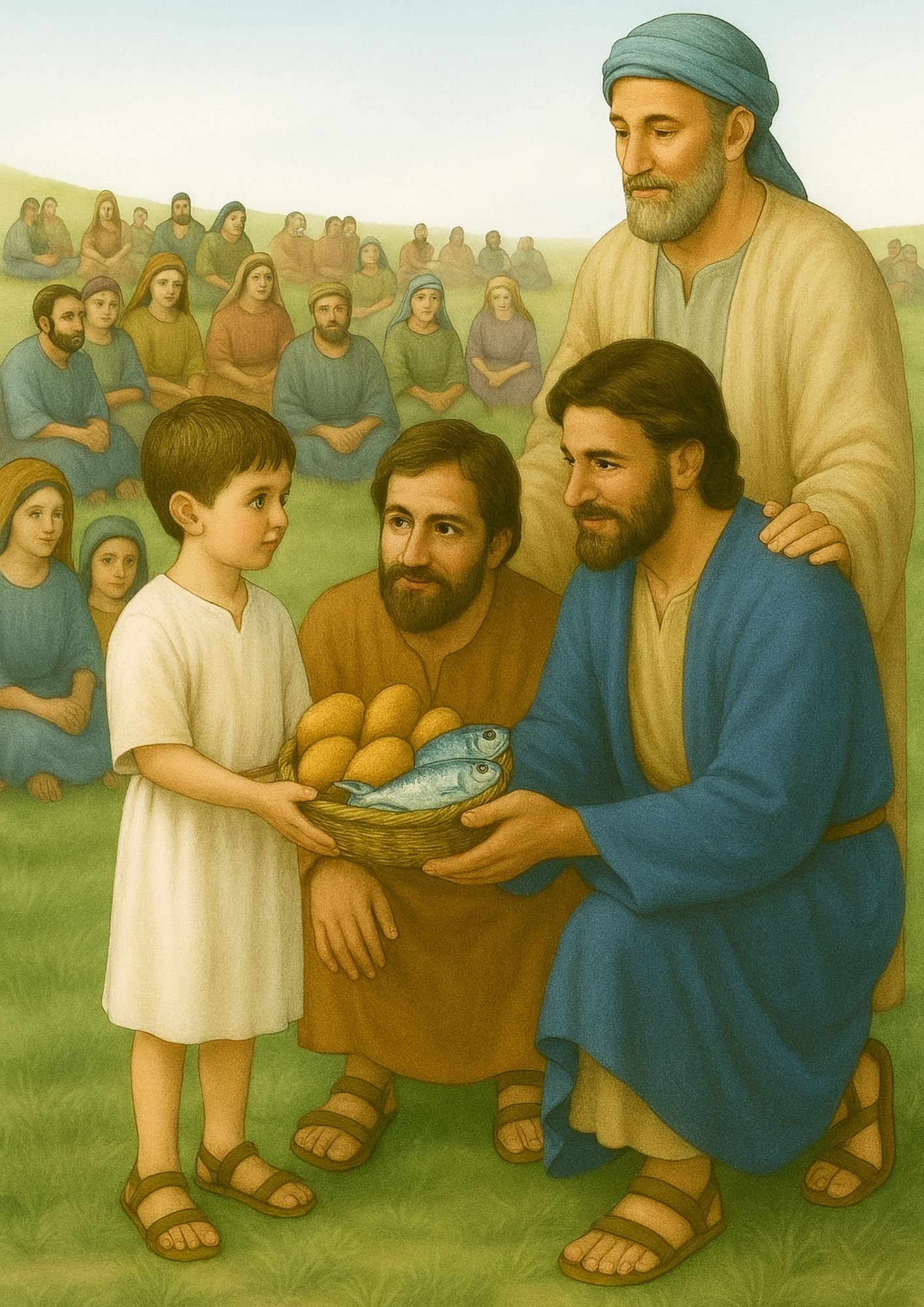 Bijbelse kaart Jongen met 5 broden en 2 vissen. Op de voorkant geen tekst. Op de achterkant nauwelijks tekst, zodat deze naar eigen inzicht op te vullen is.