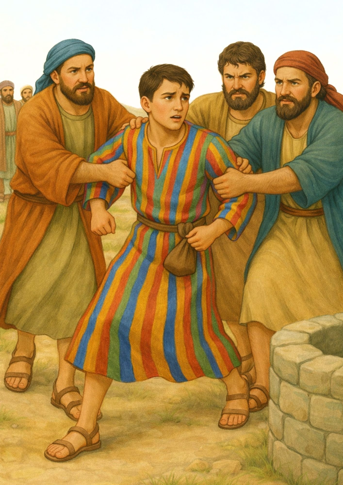 Bijbelse plaat met de afbeelding van Jozef die door zijn broers naar de put wordt gebracht.