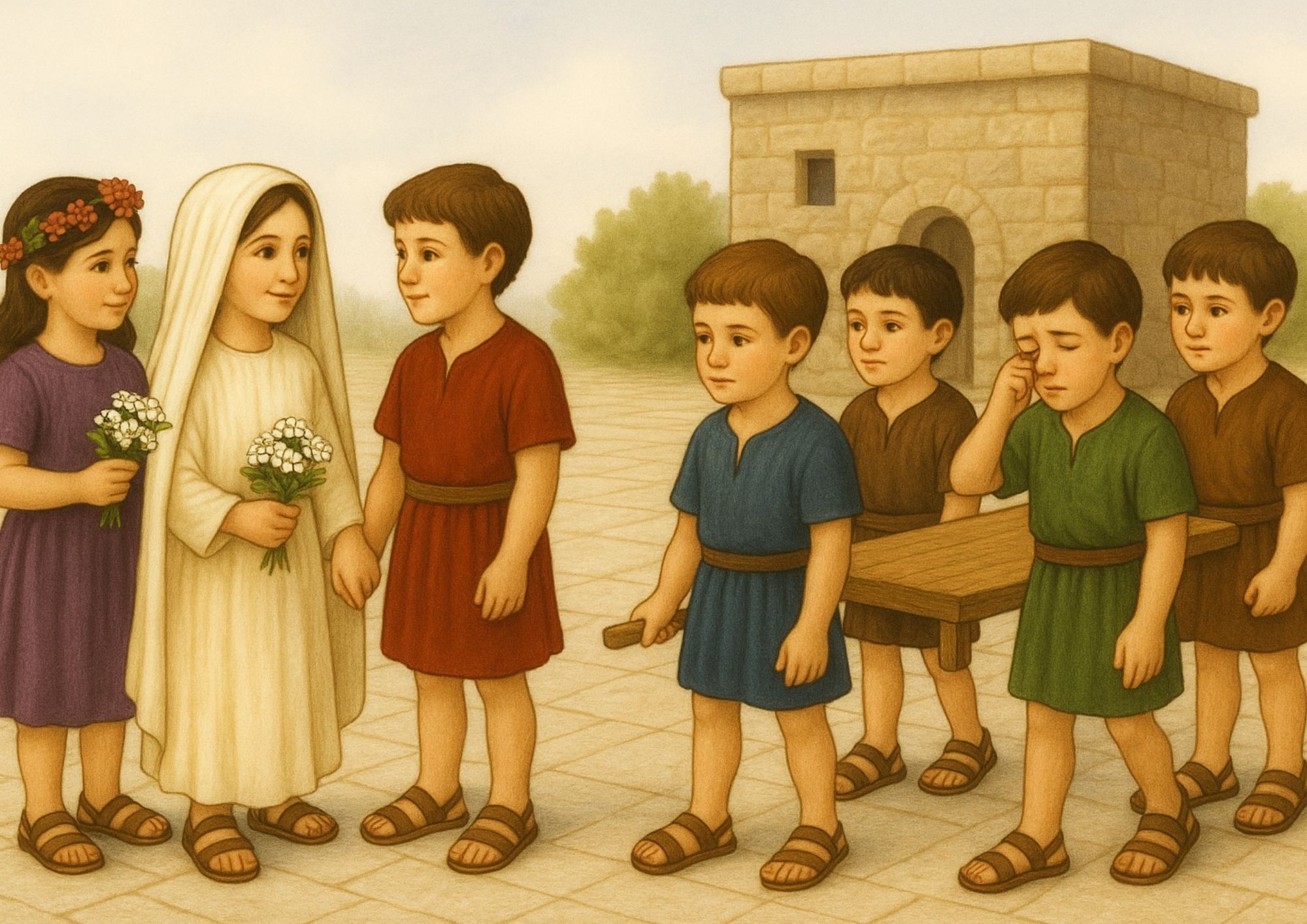 Bijbelse plaat ‘Kinderen die spelen’. Op de voorkant geen tekst. Op de achterkant weinig tekst, zodat deze naar eigen inzicht op te vullen is.