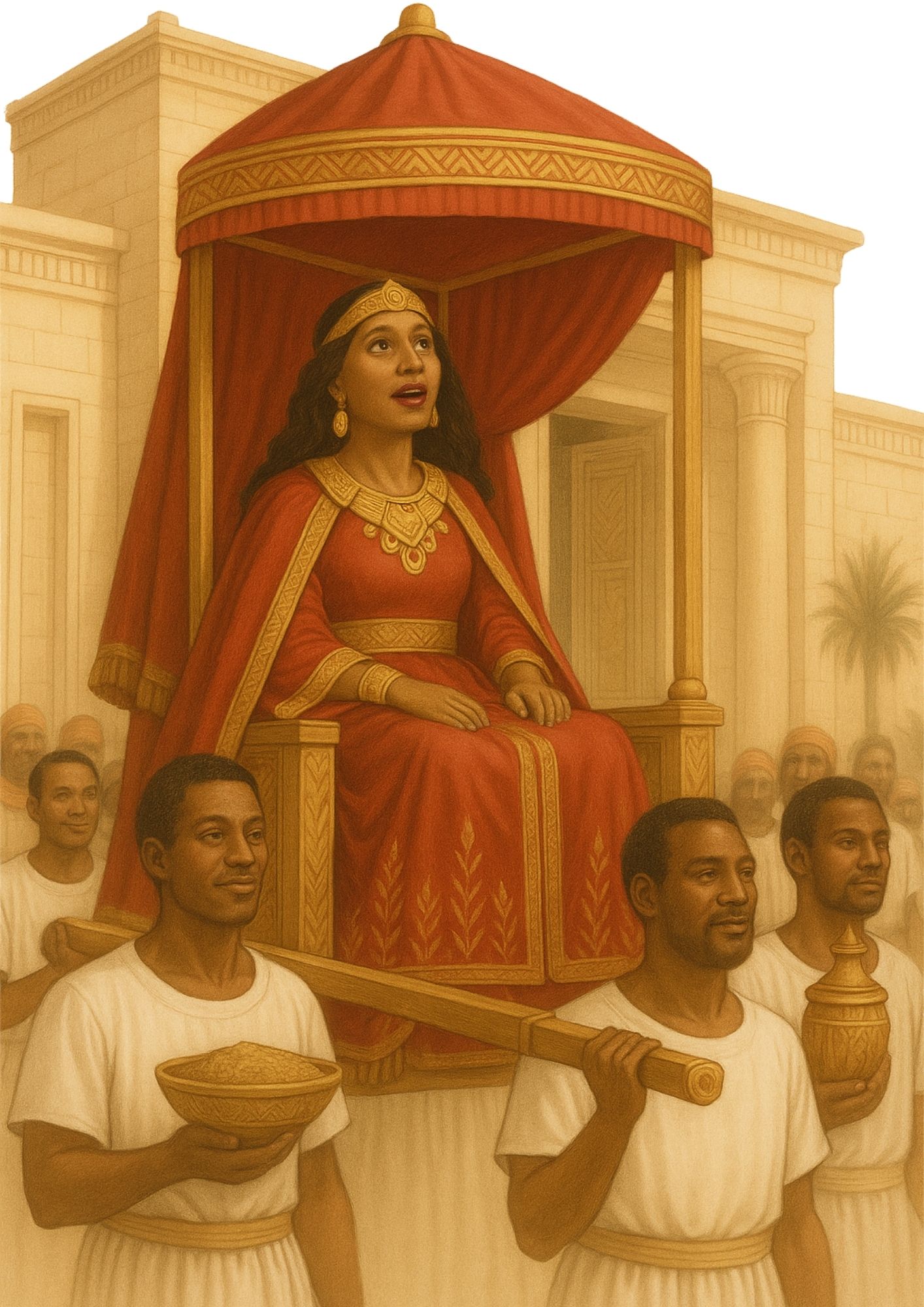 Bijbelse plaat ‘Aankomst van de koningin van Scheba’. Op de voorkant geen tekst. Op de achterkant weinig tekst, zodat deze naar eigen inzicht op te vullen is.