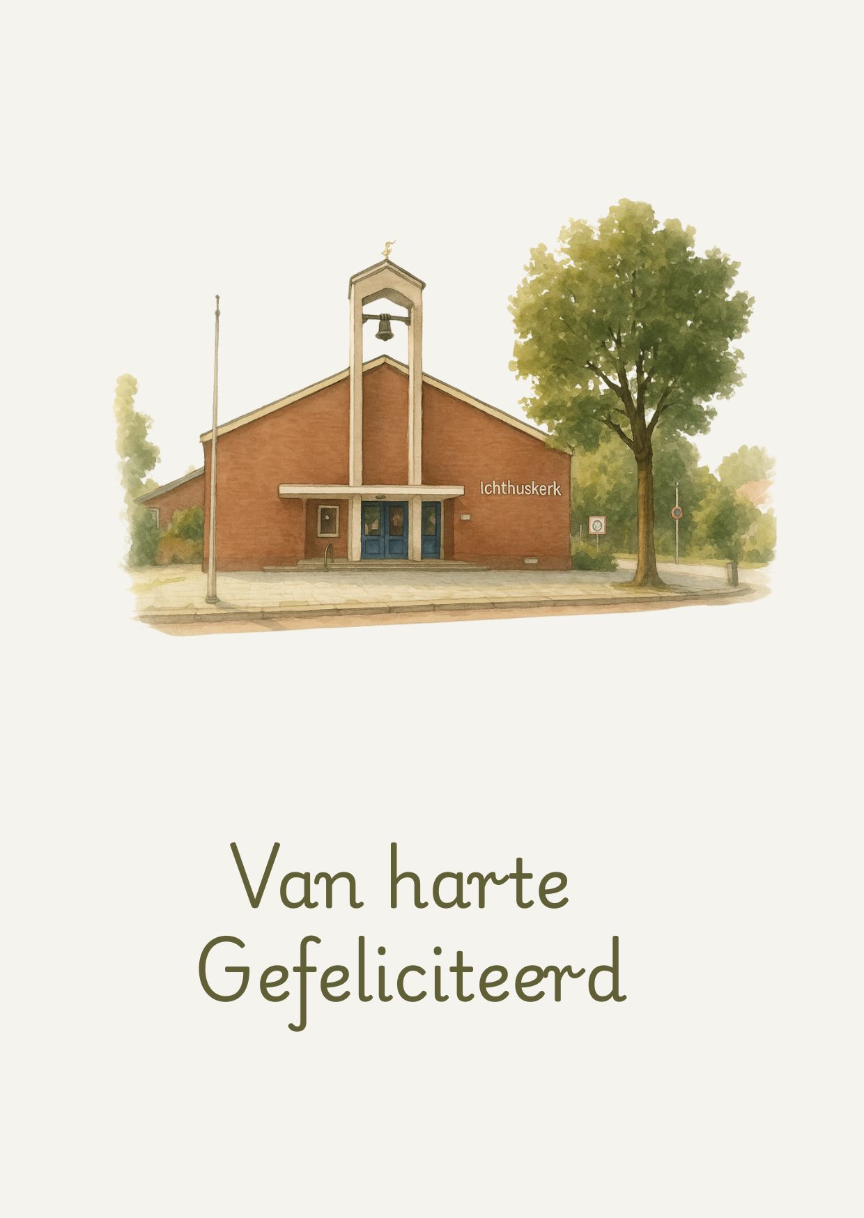 Dubbele ansichtkaart met envelop. Op de voorkant een afbeelding van de Ichtuskerk te Oldekerk.