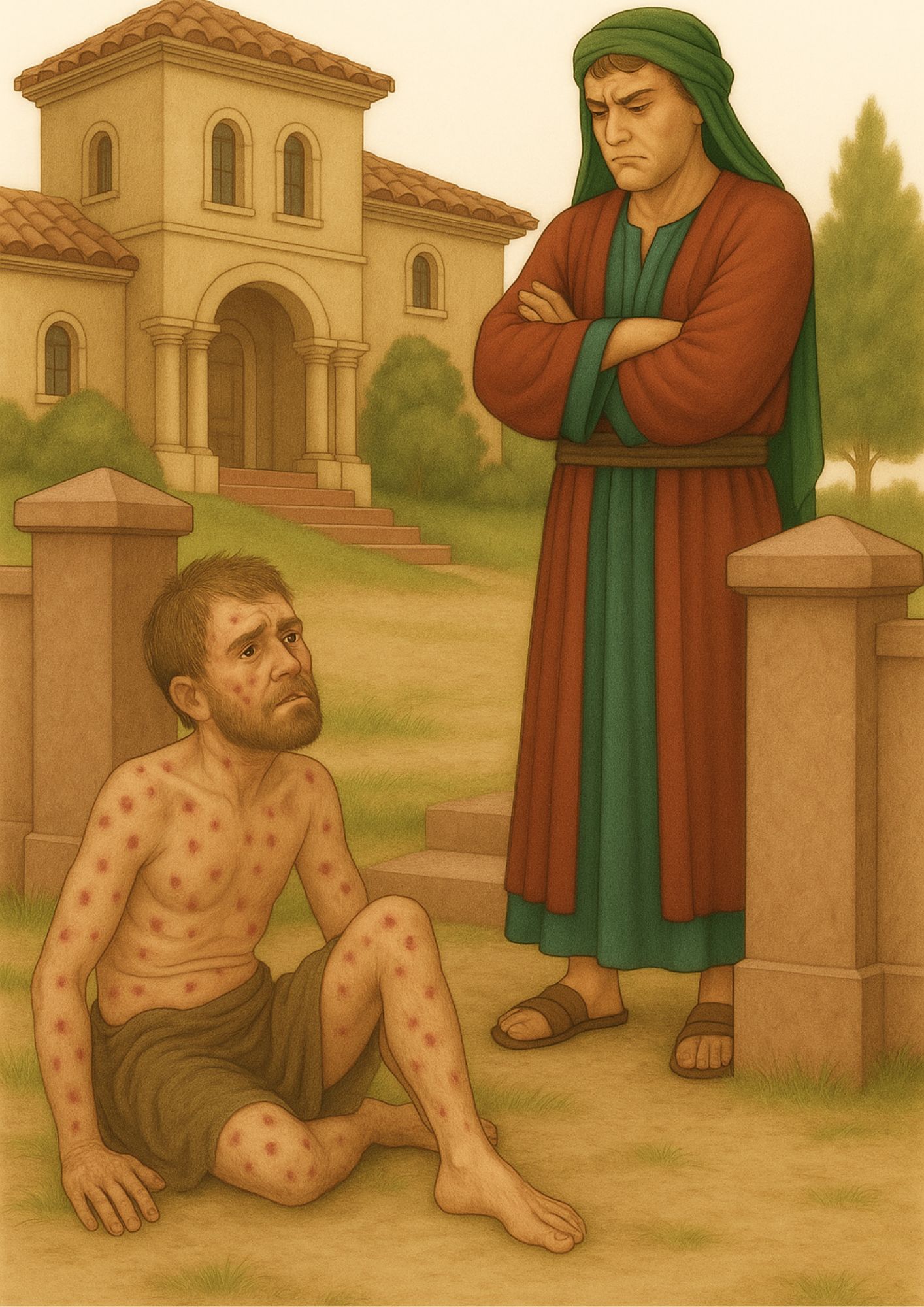 Bijbelse plaat ‘De rijke man en de arme Lazarus’. Op de voorkant geen tekst. Op de achterkant weinig tekst, zodat deze naar eigen inzicht op te vullen is.