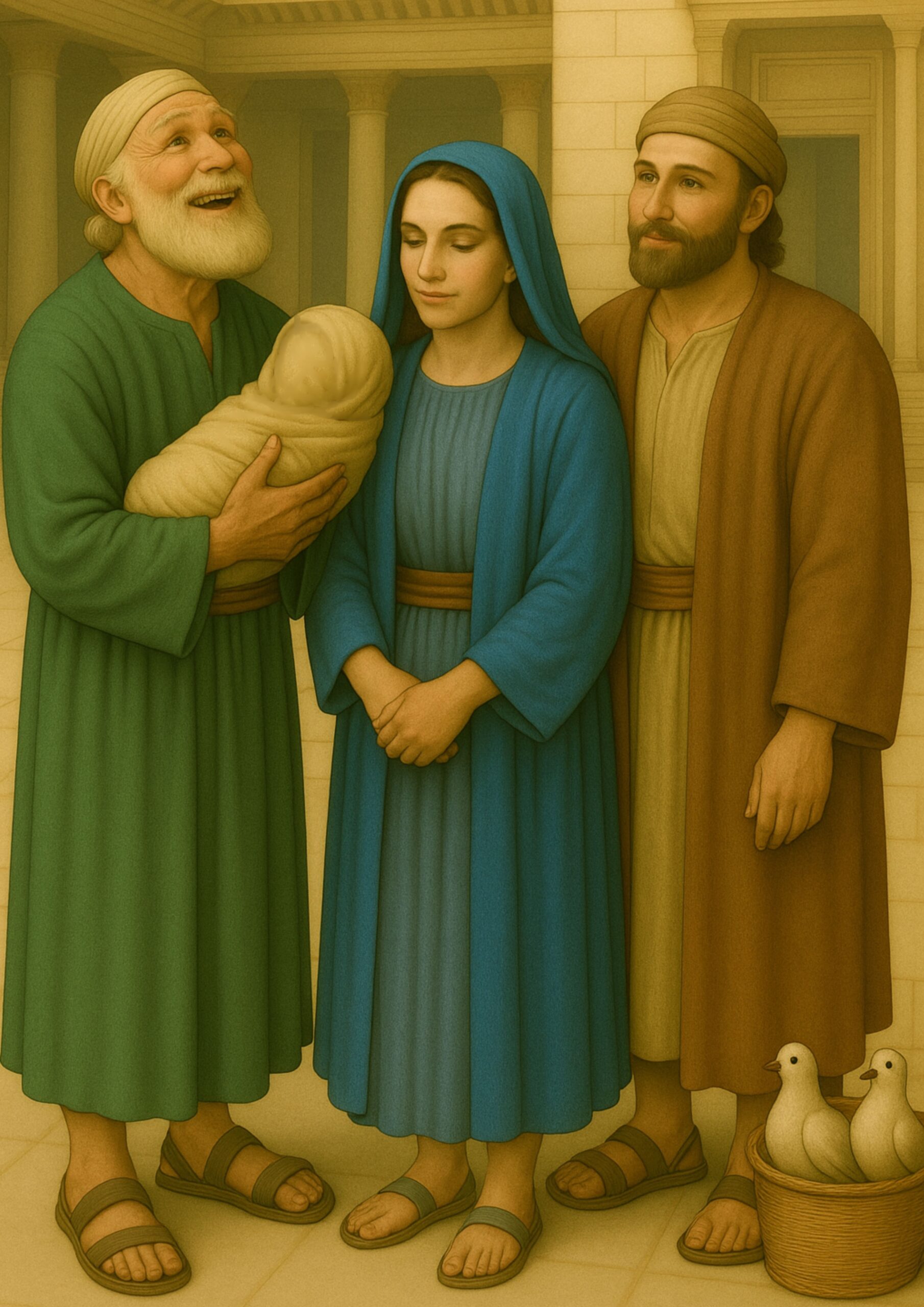 Bekijk de Bijbelse plaat ‘Simeon in de tempel’. Op de voorkant geen tekst, op de achterkant van de plaat veel ruimte om deze naar eigen inzicht te vullen. De afbeelding is afgedrukt op stevig papier (A4-formaat).