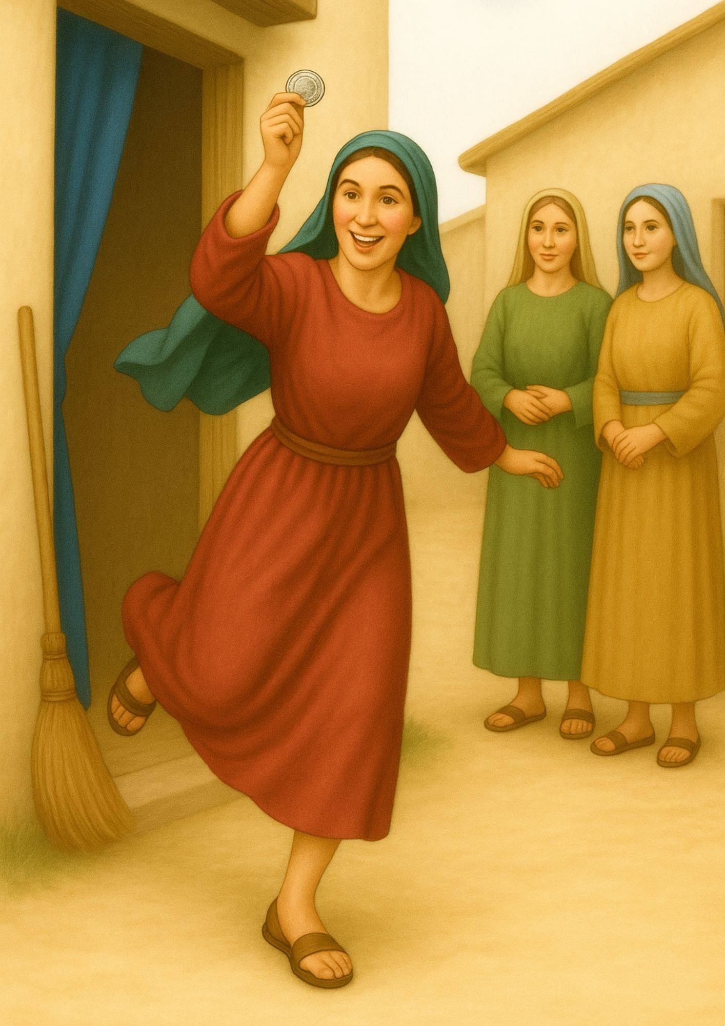 Bijbelse plaat ‘De verloren penning’. Op de voorkant geen tekst. Op de achterkant weinig tekst, zodat deze naar eigen inzicht op te vullen is.